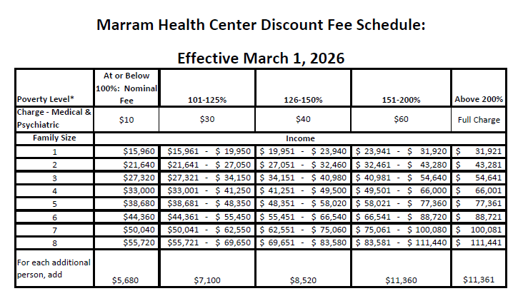 Discount eligibility is based on the Marram Sliding Fee Discount Determination Financial Assistance Policy
